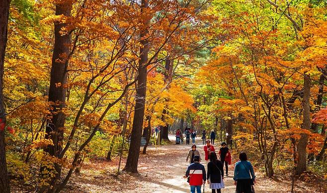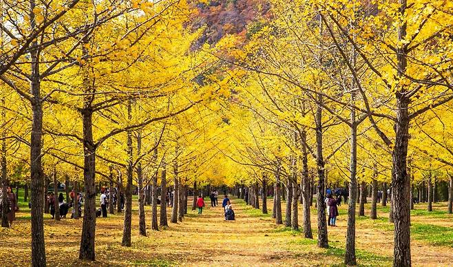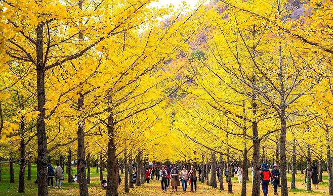숲길은 비교적 평탄해 남녀노소 누구나 편하게 산책하기 좋다. 은행잎이 머리 위에서 쏟아져 내리듯 드리우고 발아래에는 노란 융단이 깔려 있어, 걷는 내내 황홀한 장면이 이어진다.