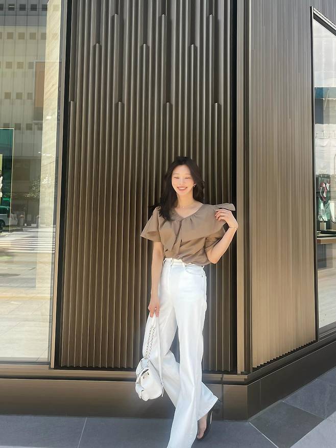 공개된 사진 속 이주빈은 브라운 컬러의 러플 블라우스와 화이트 와이드 팬츠를 매치해 깔끔하면서도 고급스러운 분위기를 자아냈어요.