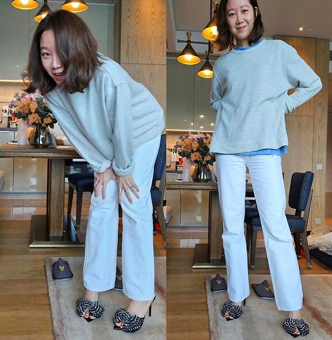 공개한 사진에서 공효진은 블랙앤화이트 땡땡이 하이힐 샌들을 신고 화이트 팬츠와 그레이 티셔츠를 착용한 꾸안꾸 데일리룩으로 다양한 포즈를 취한 모습을 드러냈다.