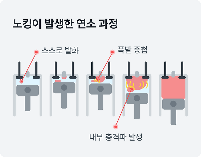 휘발유의 옥탄가가 낮으면 점화플러그가 불꽃을 튀기기도 전에 스스로 발화하여 폭발하는 경우가 생깁니다. 이후 점화플러그로 인한 정상적인 폭발이 2차적으로 중첩되며 엔진 내부에 큰 충격을 주는 노킹 현상이 발생하게 되는 것인데요!