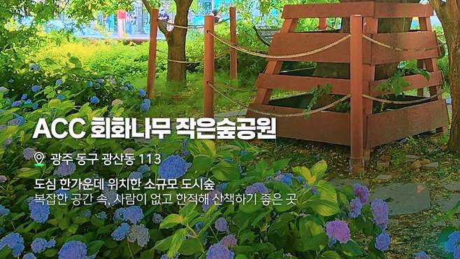 마지막으로 ‘ACC 회화나무 작은숲공원’은 동구 광산동 113에 위치한 소규모 도시숲이다. 도심 중심에 자리해 있으면서도 인적이 드물고 한적한 공간이라는 점이 가장 큰 장점이다.