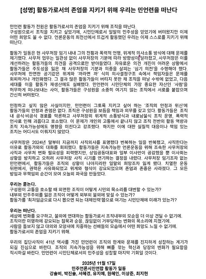 17일 민언련 활동가 7명은 "활동가로서의 존엄을 지키기 위해 우리는 민언련을 떠난다"라는 제목의 성명을 통해 집단사직 입장을 밝혔다.