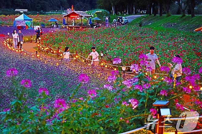 (서울=뉴스1) = 지난 22일 강원 평창군 평창읍 평강강 둔치 일원에서 열린 2024 평창백일홍축제장을 찾은 방문객들이 화려한 조명으로 장식된 백일홍밭에서 초가을의 정취를 즐기고 있다.