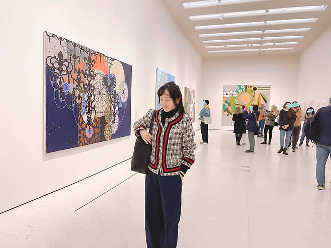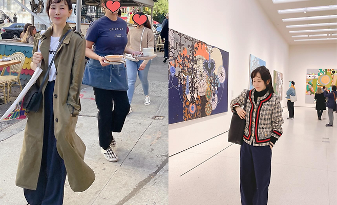 미술관에서 해이가 독특한 체크 패턴의 트위드 재킷을 선보이고 있다. 클래식한 체크 패턴에 레드 라인 디테일이 돋보이는 재킷으로 세련된 분위기를 자아내고 있다. 네이비 팬츠와의 조합으로 균형 잡힌 컬러 매치를 보여주며, 블랙 숄더백으로 실용성을 더했다. 예술 작품을 감상하는 공간에 어울리는 지적이고 세련된 스타일링으로 해이만의 패션 감각을 엿볼 수 있다.