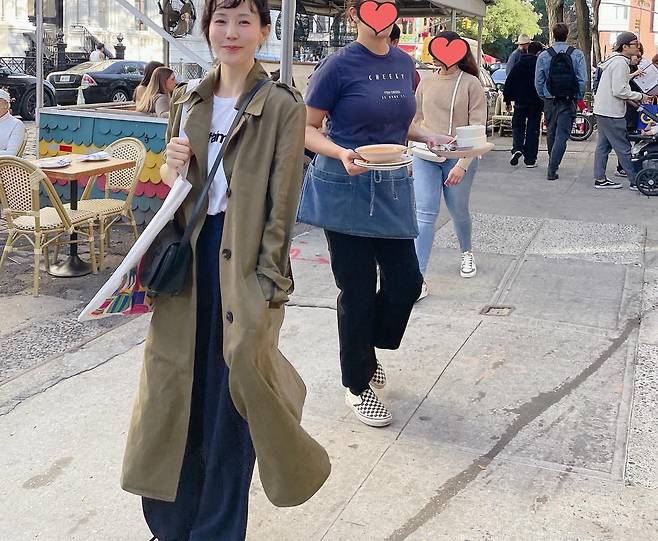 카페 거리에서 포착된 해이의 트렌디한 레이어드 룩이 시선을 사로잡고 있다. 베이직한 화이트 티셔츠에 카키색 트렌치코트를 매치하여 세련된 분위기를 연출하고 있다. 여기에 네이비 와이드 팬츠로 편안하면서도 스타일리시한 실루엣을 완성했다. 크로스백과 포스터를 들고 있는 모습에서 문화적 감성이 느껴지며, 체크 패턴 슈즈로 포인트를 주어 스타일에 재미를 더하고 있다.