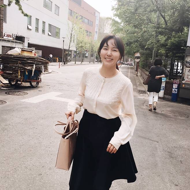 가수 해이가 도심 거리에서 클래식한 모노톤 룩을 선보이고 있다. 크림색 블라우스와 블랙 플레어 스커트의 조합으로 단정하면서도 여성스러운 분위기를 연출하고 있다. 특히 블라우스의 섬세한 핀턱 디테일이 고급스러움을 더하며, 베이지 컬러의 토트백으로 전체적인 스타일에 포인트를 주고 있다. 봄철 오피스룩으로 참고할 만한 세련된 스타일링이다.