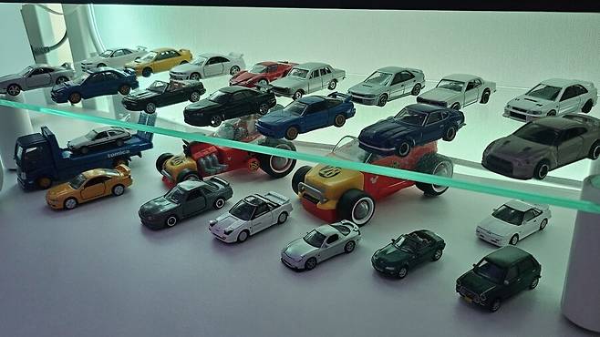 플스용 모니터 아래에는 일본 여행갈때마다 조금씩 사왔던 1:64 자동차 다이캐스트 들이 있습니다