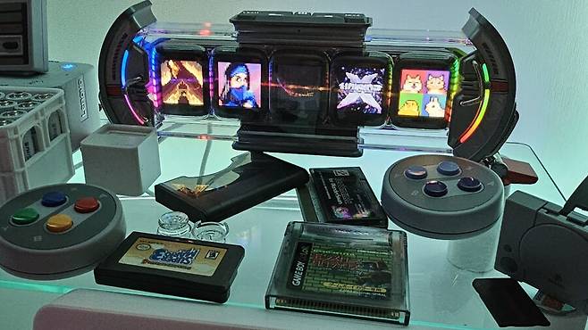 퍼니플레잉에서 커스텀 기판을 사서 CPU 및 램 이식하여 투명 쉘 + IPS액정까지 나름 풀튠이라고 해놓은 상태입니다