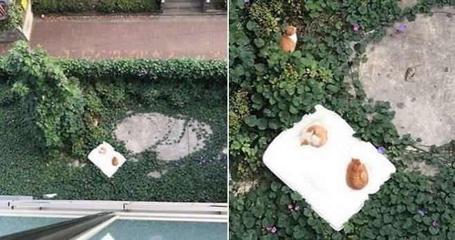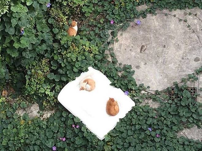 공개된 사진 속에는 햇살이 잘 드는 화단 위, 하얀 이불을 차지하고 세상 편안하게 몸을 웅크린 채 낮잠을 청하는 고양이들의 모습이 담겨 있습니다. 마치 원래 제자리인 양 자리를 잡은