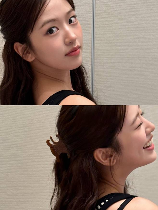 소프트한 웨이브 헤어에 반묶음을 더해 발랄한 무드가 한층 살아났고, 작은 브라운 집게핀까지 센스 있게 매치했어요.