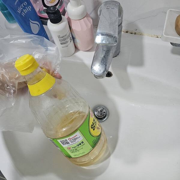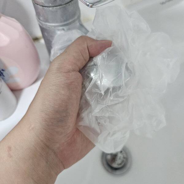 준비물은 지퍼백 같은 비닐봉지, 식초 또는 구연산, 그리고 고무줄 하나면 됩니다. 봉지에 식초를 반 정도 채운 후 수도꼭지 입구가 완전히 잠기도록 끼워주세요.
