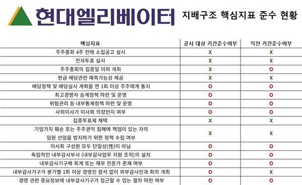현대엘리베이터는 기업가치 훼손 이력이 있는 임원의 등기를 막기 위한 장치를 두고 있지만 이를 정관에 명문화하지 않아 미준수로 분류됐다. 또 전자투표를 도입하는 대신 의결권 대리행사 권유제도를 적용해 유사한 효과를 거두고 있다. 집중투표제의 경우 정관에 '배제한다'고 명시돼 있다.