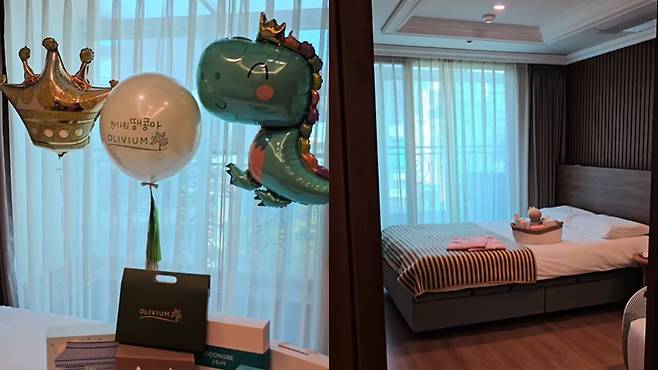 영상 속 산후조리원 거실에는 왕관, 공룡 등의 귀여운 풍선들과 함께 "반가워 땡콩아"라는 둘째 출산 축하 문구가 기재되어 있었다. 풍선 아래에는 육아에 필요한 갖가지 아기용품들이 선물처럼 진열되어 있어 몸조리를 하면서 신생아를 돌보기 안성맞춤인 환경을 제공하고 있었다.