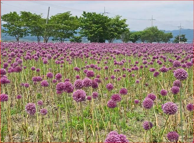 키 약 1m에 이르는 꽃들이 한들한들 춤을 추며 마치 보랏빛 융단을 깔아놓은 듯한 장관을 만듭니다.축제장 규모는 약 4ha(1만 2000평), 코끼리마늘꽃 외에도 메밀꽃과 버들마편초가 함께 어우러져 마치 꽃정원처럼 조성되어 있습니다. 곳곳에 마련된 포토존에서는 누구나 인생샷을 남기기에 더할 나위 없는 장소입니다.
