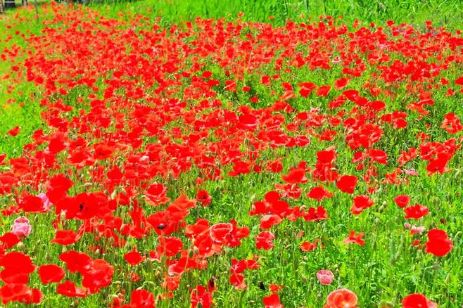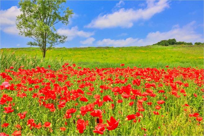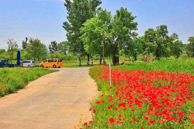 이곳의 매력은 단지 양귀비와 금계국에만 머물지 않는다. 초여름 붉은 양귀비가 5월 중순부터 물들기 시작하고, 6월 초가 되면 금계국이 바통을 이어받아 길을 노랗게 물들인다. 9월엔 코스모스가 피고, 올해는 자주빛 수레국화까지 등장해 붉은 꽃들 사이에 보랏빛 포인트를 더했다. 축제는 없어도, 계절은 스스로 시를 쓰듯 제때에 꽃을 피운다.