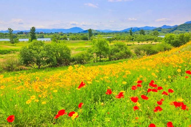 강둑길에 발을 딛는 순간, 먼저 시야가 환해진다. 초록 둑길 위로 붉고 노란 꽃잎들이 끝없이 이어지며 바람결에 출렁이고, 붉은 꽃비가 흩날리는 듯한 풍경이 걷는 발걸음을 자꾸만 멈추게 만든다. 국토교통부가 선정한 ‘아름다운 우리 강 100선’ 중 한 곳이라는 소개가 무색하지 않다.