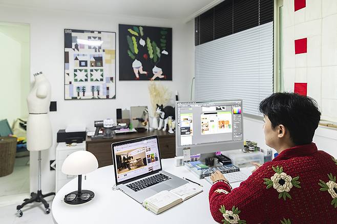 깔끔하면서도 필요한 게 다 있는 공간을 바랐어요. 업무에 필요한 책상과 컴퓨터, 무언가 만들고 싶을 때 24시간 제약 없이 만들 수 있는 공업용 재봉틀과 색색의 실들, 인테리어에 어우러지는 피규어들로 채웠죠. 이 모든 것들은 제 불안감을 해소하고 마음을 평온하게 해주는 것들이기도 해요. 개개인마다 취향이 다르겠지만 저는 공간을 꾸밀 때 내추럴함이 중요한 거 같아요. 나만의 공간이니 내게 스트레스가 제로인 공간, 자연스레 꿈을 갖도록 영감을 주는 요소들로 채워보는 것이 좋을 것 같아요.