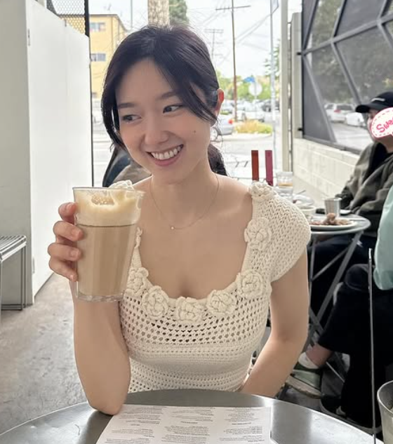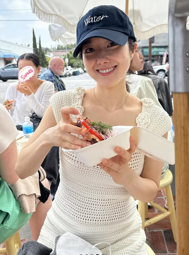 특히, 티셔츠의 유넥라인과 꽃무늬 입체 디자인은 여름 분위기를 물씬 풍기며, 그녀의 베이비페이스 외모와 글래머러스한 몸매를 돋보이게 만들었습니다. 또한, 그물짜임의 디테일이 여성스러움을 더하며, 여름철 가벼운 데일리 룩으로 완벽하게 어울렸습니다.