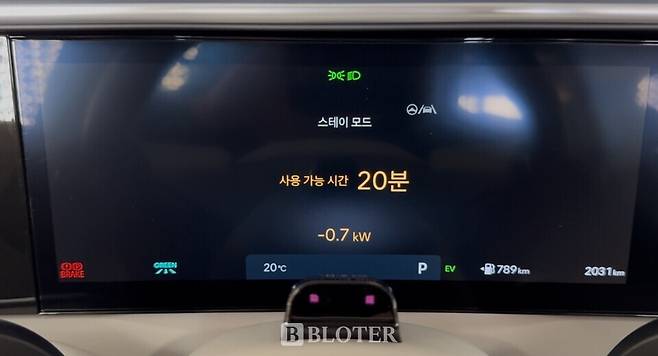 팝업창에 뜬 ‘예’ 버튼을 누르니 곧바로 엔진의 시동이 꺼지면서 스테이 모드가 시작됐다. 이 때 12.3인치 클러스터에는 스테이 모드 사용 가능한 시간이 20분으로 떴다. 현대차에 따르면 배터리 충전량 70~80% 상태에서 최대 1시간까지 스테이 모드를 사용할 수 있다고 설명했지만 시승 당시에는 배터리가 충분히 충전되지 못한 것 같다. 1시간 가까이 운전한 후 스테이 모드를 20분 동안 쓸 수 있는 것은 운전자 입장에서 안타깝게 느껴질 수 밖에 없다.