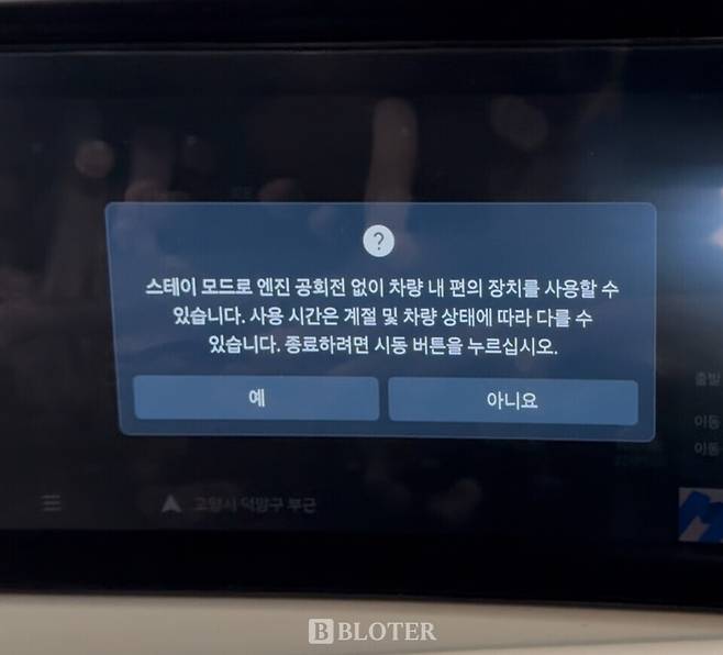 후진 주차를 한 후 기어를 ‘P(주차)’로 두니 스테이 모드 사용 관련 안내 팝업창이 12.3인치 센터페시아 디스플레이를 통해 나타났다. 이 때 “스테이 모드로 엔진 공화전 없이 차량 내 편의 장치를 사용할 수 있습니다. 사용 시간은 계절 및 차량 상태에 따라 다를 수 있습니다. 종료하려면 시동 버튼을 누르십시오”라는 문구가 안내문에 적혔다.