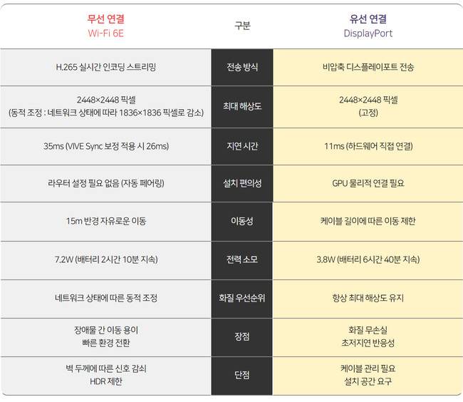 다음은 HTC의 최신 VR 헤드셋인 'VIVE Focus Vision'의 연결 방식에 따른 차이를 정리한 표이다. 'VIVE Focus Vision'은 스탠드얼론(독립형)과 PC VR 스트리밍을 모두 지원하는 하이브리드 제품이다. 무선 및 유선 연결 방식을 상황에 따라 선택할 수 있는 유연성이 매력적인 기기이다. 참고로 VIVE Focus Vision의 유선 연결은 VIVE 유선 스트리밍 패키지를 이용하면 된다. DP(DisplayPort) Alt 모드를 활용하여 GPU에서 생성된 비디오 신호를 압축 없이 전송한다. 5K 해상도(눈당 2448×2448픽셀)와 90~120Hz 재생률을 지원한다. 반면 무선은 Wi-Fi 6E로 연결하며, 6GHz 대역에서 160MHz 채널 폭을 활용한다. 이론상 최대 3.6Gbps 속도를 제공하지만, 실제 테스트 환경에서는 1.2Gbps 정도로 처리된다. 특히 주목할 점은 동적 비트레이트 조정 기능으로, 네트워크 혼잡 시 해상도를 1836×1836픽셀까지 하강시켜 몰입감 저해 요소인 프레임 드롭을 방지한다.