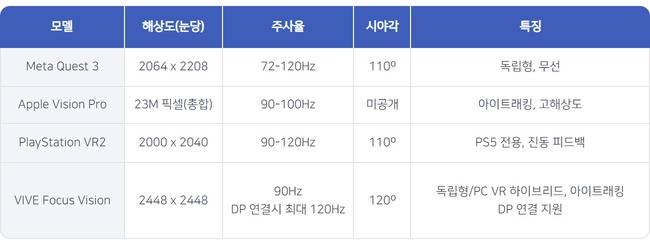 Meta Quest 3는 스탠드얼론(독립형) 기기이면서도 강력한 성능을 제공한다. 해상도는 눈당 2064 x 2208 픽셀이며, 120Hz 주사율을 지원한. 배터리 수명은 2-3시간이고, 무게는 515g으로 비교적 가벼운 편이다. Apple Vision Pro는 애플의 최신 혼합현실 헤드셋으로, 23백만 픽셀의 마이크로 OLED 디스플레이를 탑재했다. 90Hz, 96Hz, 100Hz의 주사율을 지원하며, 아이트래킹 기술이 포함되어 있다. PS5 전용 VR 헤드셋인 PlayStation VR2는 눈당 2000 x 2040 픽셀의 OLED 디스플레이를 탑재했다. 90-120Hz 주사율과 110도의 시야각을 지원하며, 진동 피드백 기능이 포함되어 있다.