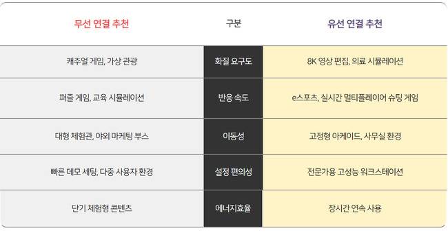 따라서 몰입감을 우선한 고화질 PC VR 게임을 플레이하려면 DP로 연결하는 방식이 최선이다. 다음은 사용 사례별 유선과 무선의 연결 적합성을 비교한 표이다.