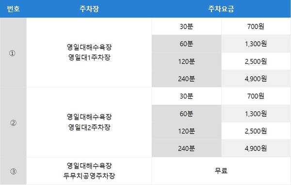 포항국제불빛축제를 진행하는 기간 동안에는 관람객 인파가 굉장히 몰릴 예정이라, 위에 보여드리는 주차비를 납부하는 정식 주차장 외에 임시 주차장을 개방할 예정입니다.