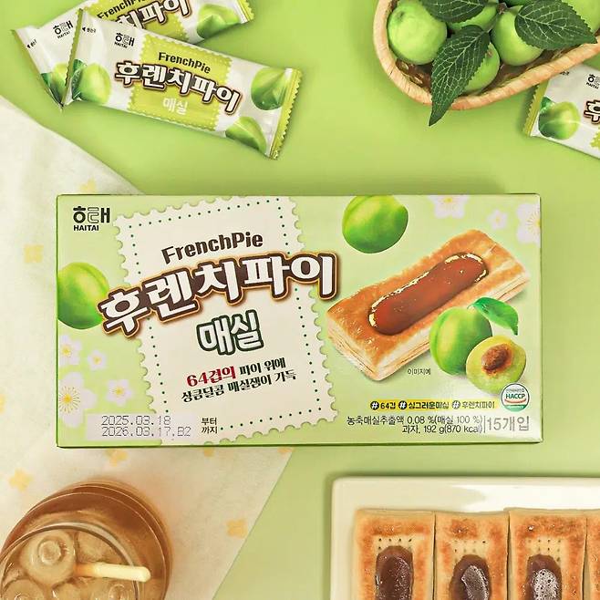 후렌치파이가 초코맛에 이어 봄을 맞아 매실 맛을 내놨다. 지리산 하동 매실로 만든 상큼한 매실잼이 64겹 파이 위에 올라갔다. 43만 개 한정 판매한다고. 가격은 3,980원.