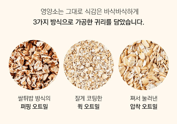 3가지 방식으로 가공하여 오트밀의 영앙소는 그대로 보존하면서