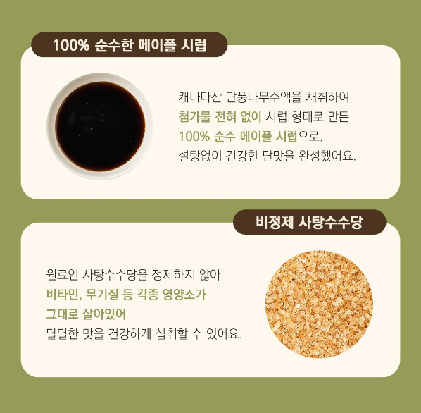 에브리데이 그래놀라는 첨가물 없는 100% 순수 메이플 시럽과 비정제 사탕수수당으로