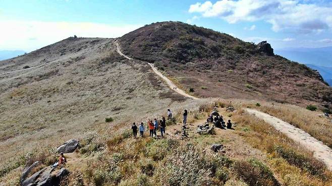 경상남도 합천군과 산청군을 아우르는 황매산군립공원은 가을마다 은빛 억새꽃 물결로 뒤덮인다.