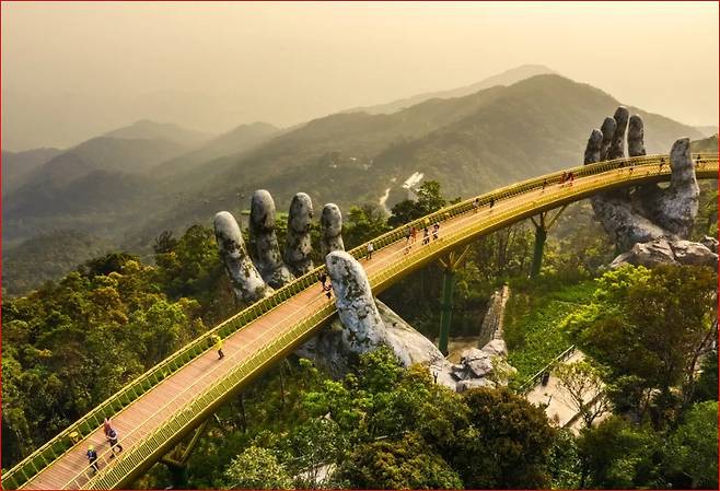 2018년 공개된 골든 브릿지(Golden Bridge)는 바나힐의 상징이 되었습니다. 두 개의 거대한 손이 황금빛 다리를 받치고 있는 형상은 ‘산의 신이 인간에게 건네는 선물’을 의미합니다. 그러나 이 다리는 단순한 조형물이 아니라, 많은 이들에게 베트남이 겪어온 아픈 역사를 딛고 다시 일어서는 상징으로도 읽힙니다. 구름 위를 걷는 듯한 이 다리는 지금도 전 세계 SNS에서 가장 많이 공유되는 장소 중 하나입니다.