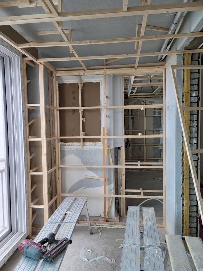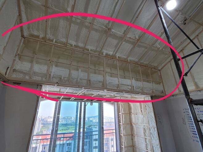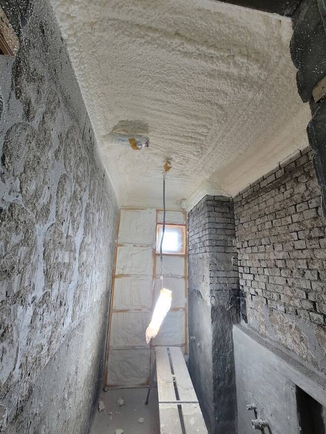 매도자분께서 집이 너무 추웠다고 하셨고 또 남편도 어릴적 탑층 살았을 때 추웠던 기억밖에 없다고 해서 단열에도 힘을 줬습니다. 보통 단열한다고 하면 아이소 핑크를 붙이는 경우가 많은데 저희 집은 층고도 높고 해서 경질폼 단열로 진행했어요. 경질폼 단열은 각재로 폼을 쏠 공간들을 만들어준 다음 엄청 큰 기계로 폼을 쏴줍니다.