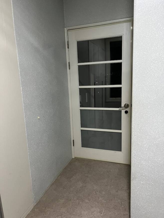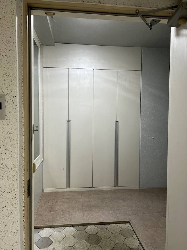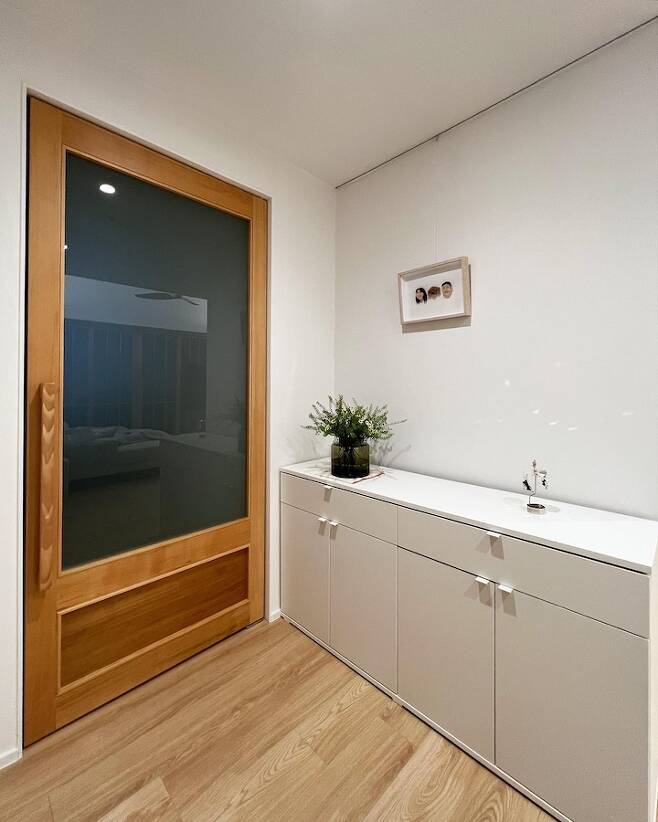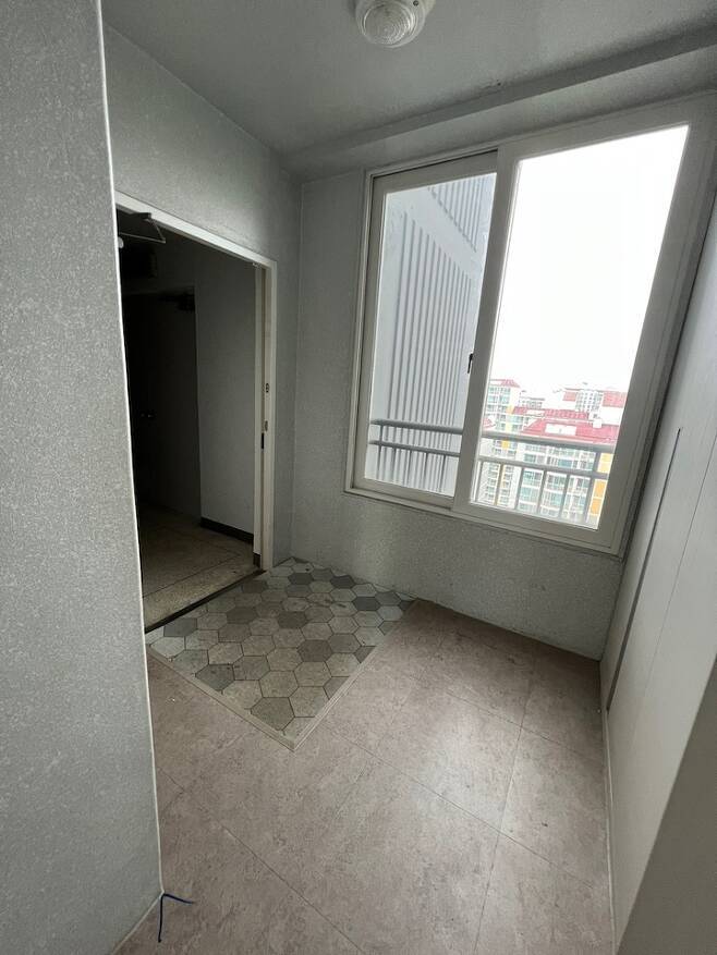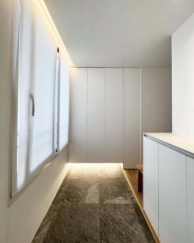 전실입니다. 저는 구축의 구조를 좋아하는데 그 중 하나가 전실이 넓은 점이에요. 이 집은 특이하게 거실 화장실의 창이 전실 쪽으로 나있었는데 그걸 막아 반장을 만들고 안에는 전기자전거 충전을 위한 콘센트를 빼뒀습니다. 전실의 창으로 맞은편 아파트의 거실이 마주하고 있어 한지 느낌의 블라인드를 설치했어요.