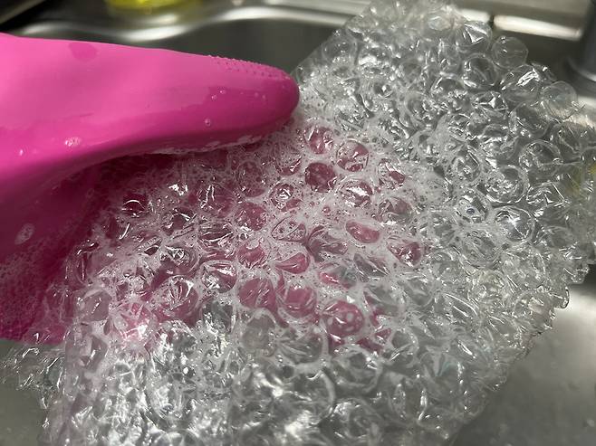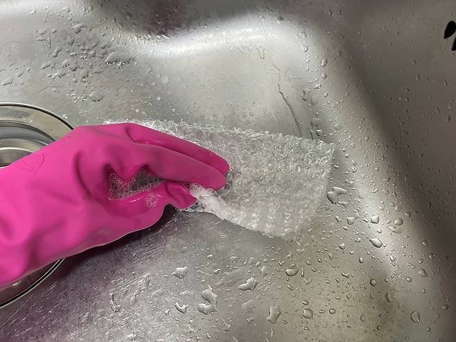 뽁뽁이에 세제를 묻힌 후 물을 살짝 묻히면 의외로 거품이 잘 납니다. 수세미 대용으로 뽁뽁이를 활용하여 싱크대를 구석구석 닦아 보세요.