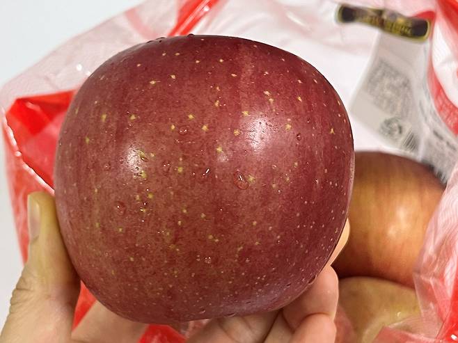 사과 색상은 전체적으로 붉은색이 선명하고 고르게 퍼져 있는 사과가 신선합니다.