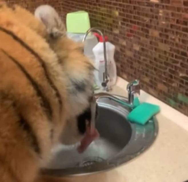 그것도 두 발로 일어서서 싱크대 물을 허겁지겁 먹고 있는 호랑이. 아무리 보고 또 봐도 호랑이가 집안에 이렇게 들어와 돌아다닌다는 사실에 소름이 쫙 돋는데요.