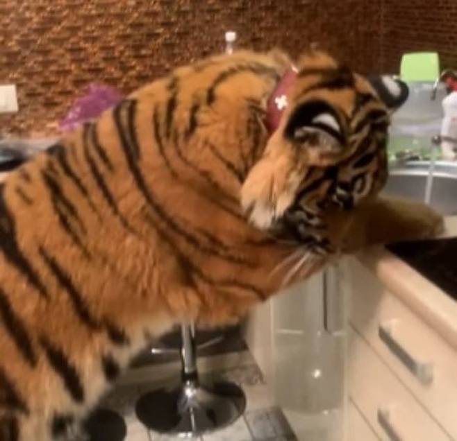공개된 영상에 따르면 호랑이는 마치 자기 영역이라도 되는 듯 아주 자연스럽게 부엌 싱크대에 다가가 두 발로 일어서서 물을 먹고 있었는데요.