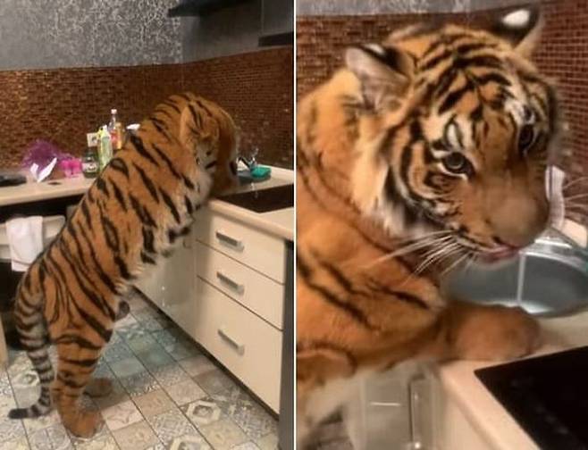 부엌 싱크대에서 물 먹는 호랑이의 모습 / instagrma_@mihail_tiger