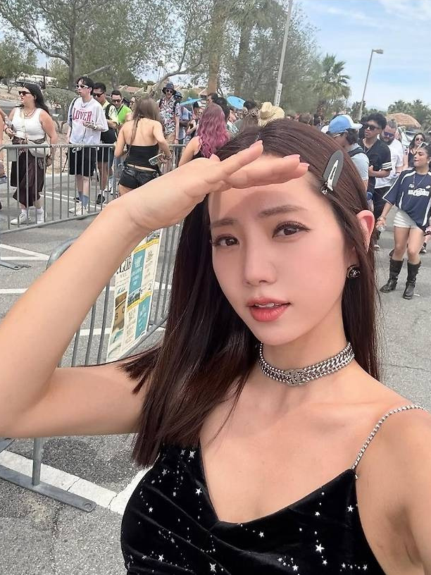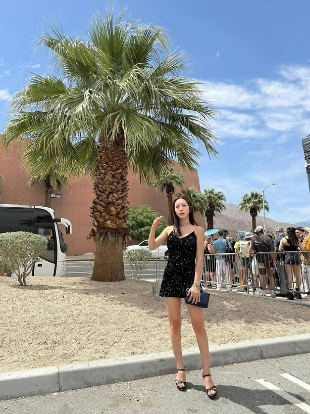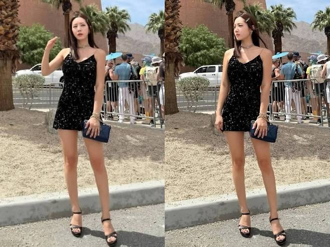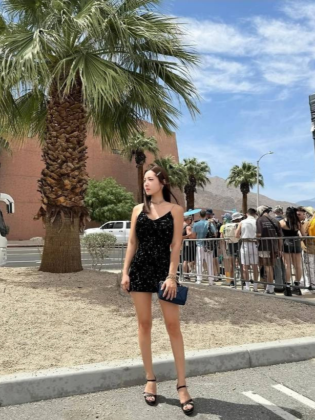 블랙 벨벳 소재에 별빛처럼 반짝이는 스팽글이 더해진 미니 드레스를 착용해 현장의 햇살과 완벽한 조화를 이뤘습니다.