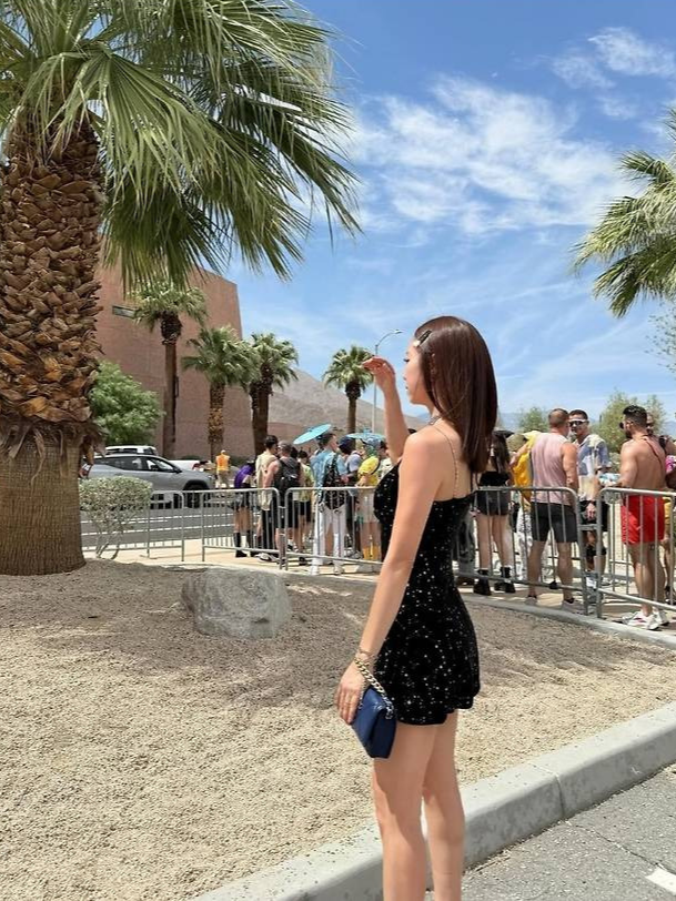 가녀린 체인을 더한 슬리브리스 디자인은 한층 더 고혹적인 무드를 연출했고, 과감하게 드러낸 어깨와 다리는 시원한 코첼라 분위기와 찰떡이었습니다.