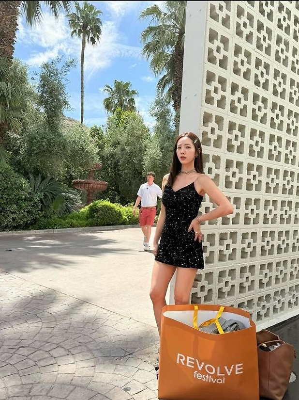 특히 블루 컬러 클러치와 블랙 스트랩 힐은 세련된 페스티벌 감성을 살려주며, 정순주 표 휴양지 글램룩의 진수를 보여줬습니다.
