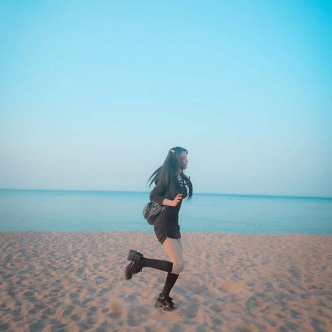 특히 눈에 띄는 건 체크 패턴의 백팩이다. 심플한 블랙 룩에 하나의 포인트가 되어 전체적인 스타일의 밸런스를 잡아준다. 헤어는 자연스럽게 풀어 내렸고, 앞머리는 핀으로 넘겨 발랄한 분위기를 더했다. 긴 머리와 리본, 니삭스 조합은 한때 유행한 '스쿨룩'을 연상시키면서도 해변이라는 이색 배경 속에서 오히려 더 감각적으로 느껴진다.