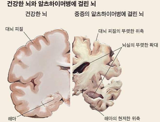 알츠하이머병이란 뇌의 신경 세포가 시간 흐름과 함께 죽어가는 질환을 통틀어 지칭하며, 이 병에 걸린 환자의 대뇌 피질은 뇌 표면에서부터 안쪽에 걸쳐 위축이 진행되며 뇌가 쪼그라든다. 특히 뇌의 앞쪽과 옆쪽에서 이러한 현상이 뚜렷하게 나타난다.