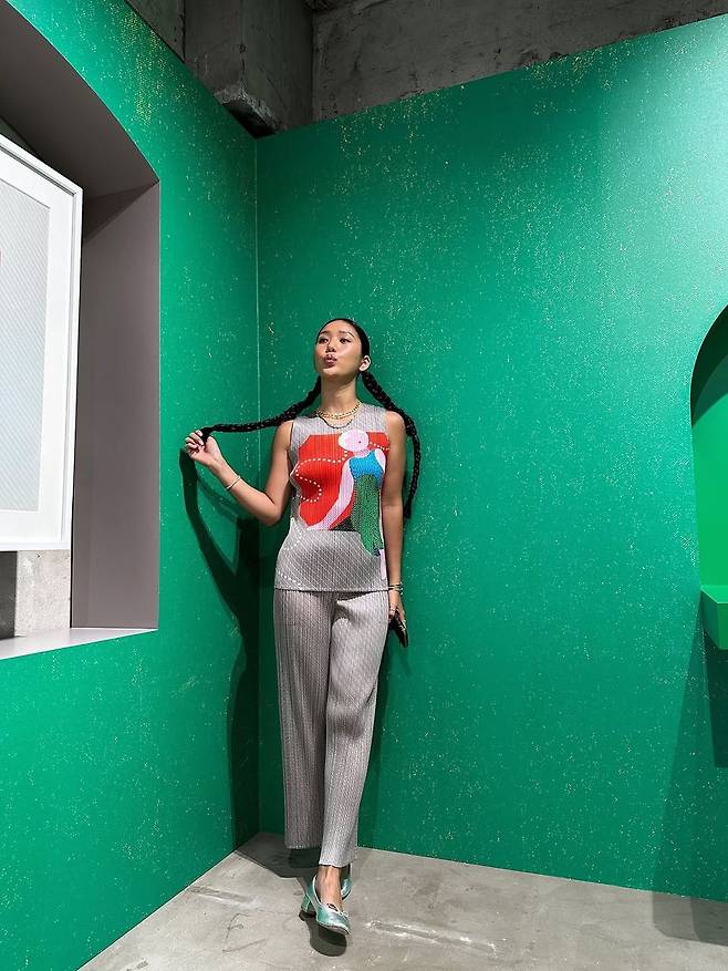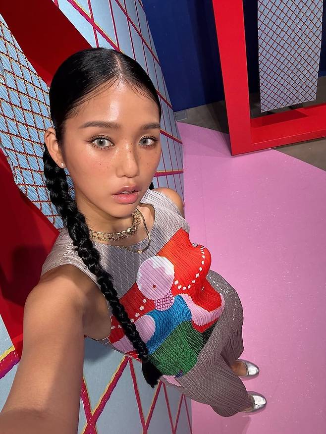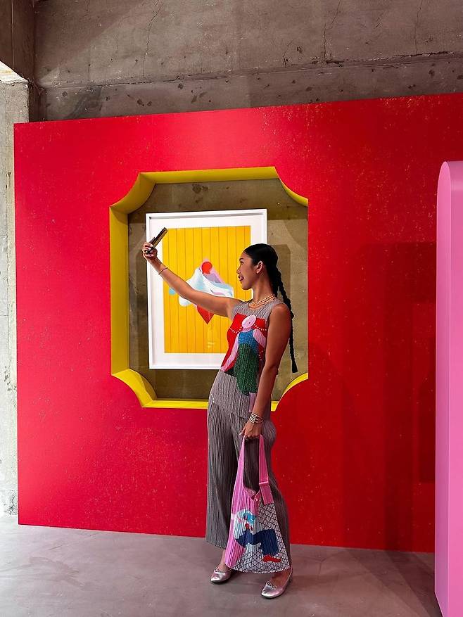 미미가 선보인 여름 패션이 단숨에 시선을 사로잡았다. 원색 프레임 앞에서 셀카를 찍는 순간, 강렬한 컬러 조합과 독특한 실루엣이 시각적으로 강한 인상을 남겼다. 구조적인 주름과 대담한 색감으로 완성된 ‘이세이미야케’의 탑은 미미만의 감각적인 무드와 완벽히 어우러졌다.