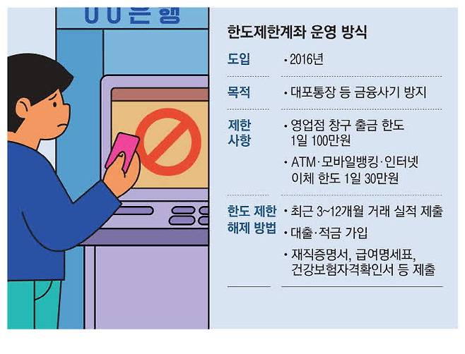 소규모 업체 대표 A씨는 새로 개설한 계좌로 직원들 급여를 이체하려 했지만 인터넷뱅킹 거래 한도가 30만원으로 제한돼 있어 며칠에 걸쳐 쪼개기 송금을 해야 했다. 한도를 풀기 위해 은행에 문의했지만 신규 법인으로서는 제출이 어려운 납세증명원, 부가가치세증명원 등 각종 서류를 제출해야 한다는 답변에 포기할 수밖에 없었다. 이처럼 은행, 저축은행 등에서 금융거래 시 송금이나 이체 금액이 제한됐던 한도제한계좌의 거래 한도가 상향된다. 2016년 금융사기에 쓰이는 대포통장 개설을 막기 위해 도입된 지 7년 만이다. 금융당국과 국무조정실은 은행권 의견수렴을 거쳐 한도 상한선을 재설정해 연내 발표할 방침이다.