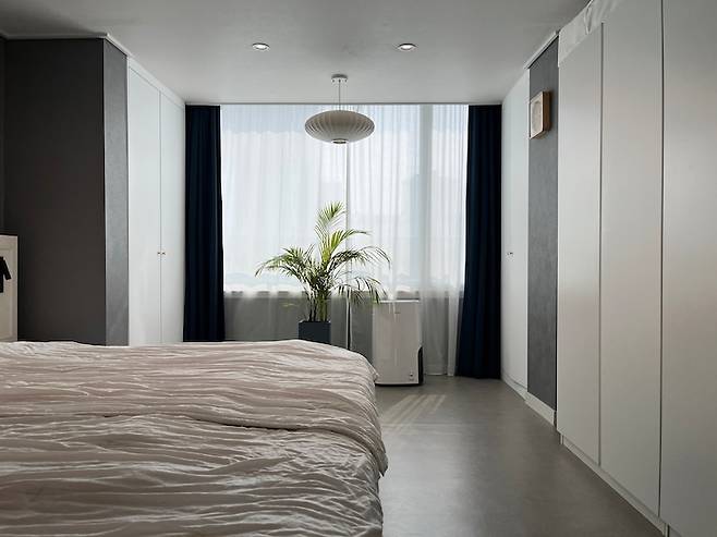 안방은 천장 벽지를 제외하고 사면을 어두운 그레이 컬러 벽지로 연출했습니다. 안방 베란다도 확장을 했기 때문에 확장한 양쪽 사이드에 붙박이 장을 설치 하여 이불장과 옷을 수납할 수 있게 되었습니다.