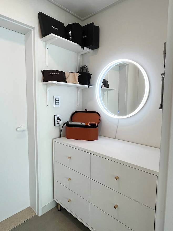 안방과 안방 화장실 사이에는 작은 드레스룸이 있습니다. 기존에 빌트인 되어있던 수납장 겸 화장대를 철거하고,사이즈에 맞춰 서랍장을 구입히여 화장대로 활용하고 있어요. 서랍장에 수납이 많이 되어 실용적입니다.