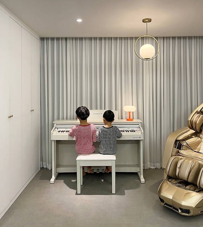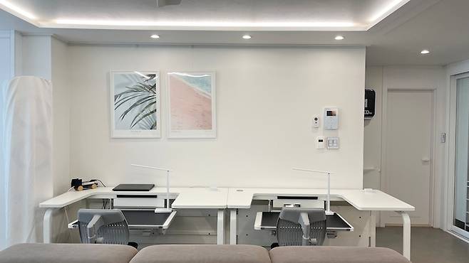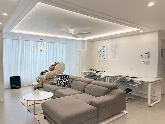 거실에 안마의자, 큰 소파, 큰 책상 두 개라는 큰 가구들이 면적을 차지해, 좁고 답답해 보이진 않을까 걱정했는데요. 생각보다 답답하지 않고 공간을 나누어 활용하니 실용적이면서 네명의 가족이 함께 할 수 있게 되었습니다.